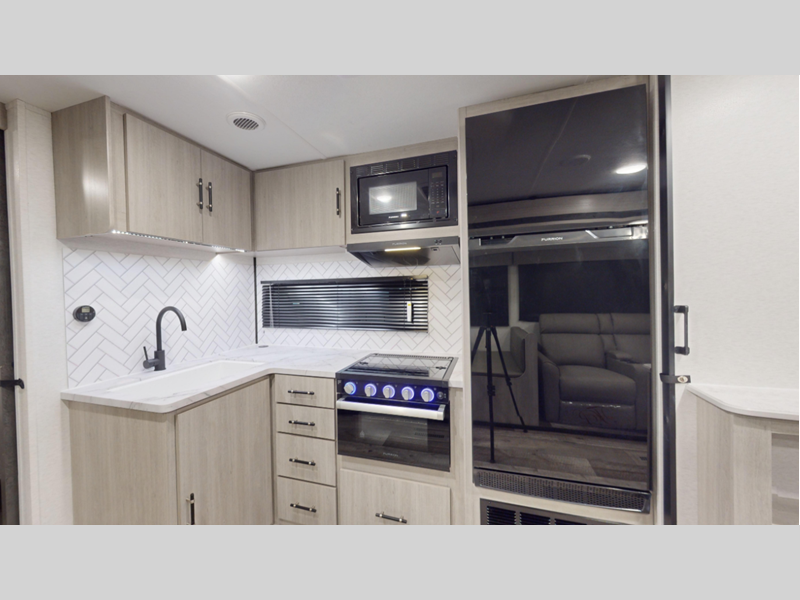 Slides 3 Length 22 ft 6 in Ext Width 8 ft Ext Height 10 ft 4 in Interior Color Breezy Beige, Granite Gray Hitch Weight 400 lbs Dry Weight 3809 lbs Cargo Capacity 991 lbs Fresh Water Capacity 45 gals Grey Water Capacity 30 gals Black Water Capacity 30 gals Available Beds Murphy Queen Refrigerator Size 10 cu ft Cooktop Burners 3 Shower Size 30" x 36" Number of Awnings 1 LP Tank Capacity 20 lbs Water Heater Type On Demand Gas AC BTU 13500 btu Awning Info Power with LED Lights Axle Count 1 Number of LP Tanks 1 Shower Type Standard Electrical Service 30 amp Similar Floorplans