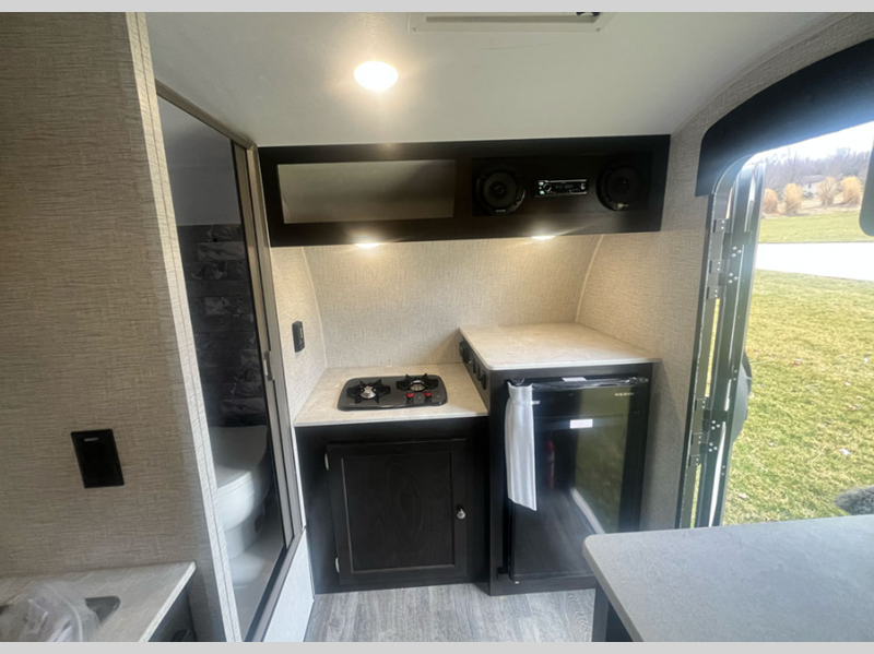 - Exterior kitchenette with microwave, 12V refrigerator and Blackstone Griddle (10LT, 12LT only)
